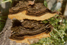 【性状介绍】子实体多年生,木栓质,无辆,菌盖扁米球形至马蹄形,4-14cm7×24cm,罕达23cm×40cm,厚2.5-18.5cm或更大。盖面初期有红褐色胶状皮壳,渐角质化而成灰色至黑色,并有宽的棱带,边缘往钝,初期近白色,后渐变淡黄色至赤粟色,下侧无子实层。菌肉近白色至淡黄褐色,有环纹,木栓质至木质。厚0.5-2cm,味苦。菌管多层,每层厚3-5毫米,淡黄色,管口白色至乳白色。孢子卵圆形或椭圆形,无色。