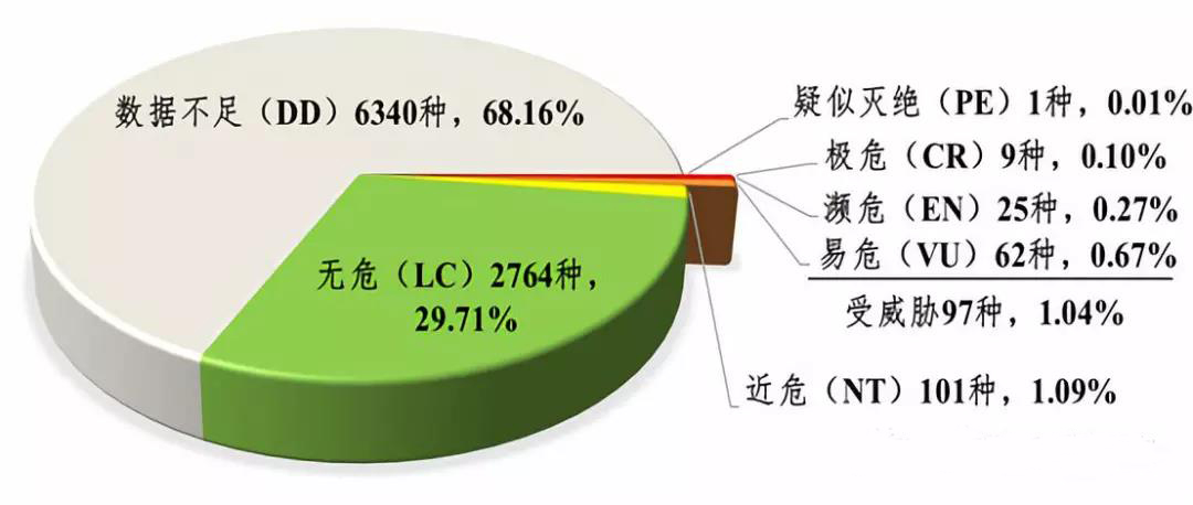 本次评估的中国大型真菌有9302种,其中大型子囊菌870种、大型担子菌6268种、地衣型真菌2164种,分属于2门14纲62目227科1298属。评估数据主要来源于微生物研究所建立的《中国菌物名录数据库》。评估结果显示:中国大型真菌属于疑似灭绝(PE)的有1种,极危(CR)9种、濒危(EN)25种、易危(VU)62种、近危(NT)101种、无危(LC)2764种、数据不足(DD)6340种。依据现有的数据,本次评估未评出可确认为灭绝(EX)和野外灭绝(EW)的物种。其中,受威胁、近危以及数据不足的物种均为需要关注和保护的物种,因此,中国需关注和保护的大型真菌达6538种,占被评估物种总数的70.29%。